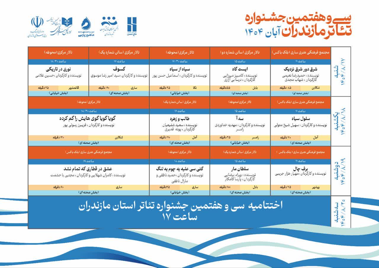 گفتنی است سی‌و‌هفتمین جشنواره تئاتر استان مازندران از هفدهم تا بیستم آبان‌ماه جاری به دبیری امیرحسین (ایمان) فلاحت‌پیشه اجرا و آیین اختتامیه آن سه‌شنبه ۲۰ آبان ۱۴۰۴ در تالار مرکزی ساری برگزار می‌شود.