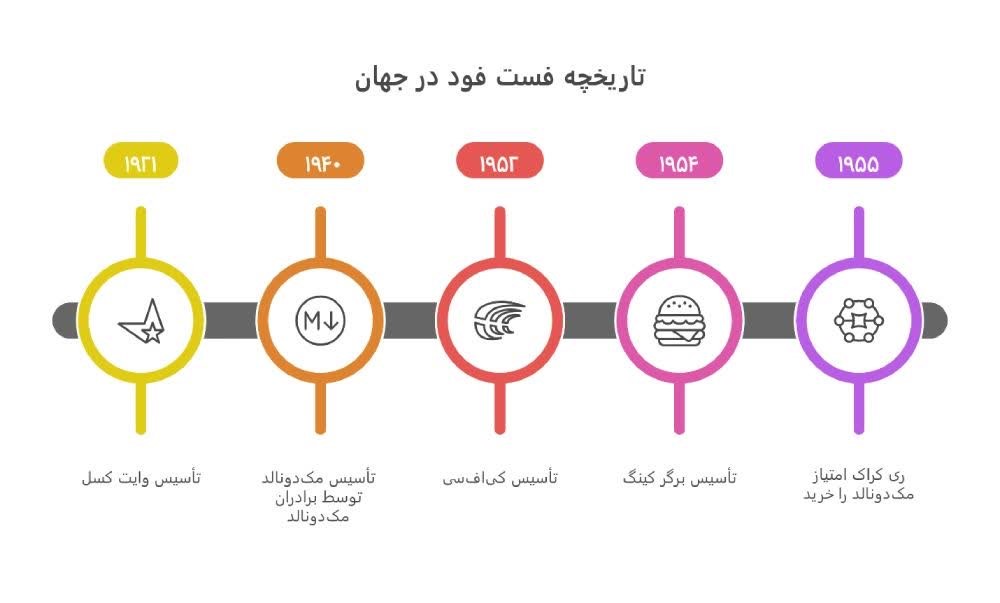 در دهه ۱۹۴۰،  ریچارد و موریس مک‌دونالد، رستوران خود را در کالیفرنیا تاسیس کردند و در سال ۱۹۵۵ ری کراک با خرید امتیاز برند مک‌دونالد (MacDonald's) این نام را به بزرگترین برند فست فود جهان تبدیل کرد. پس از مک‌دونالد، برندهای برگر کینگ (Burger King) در سال ۱۹۵۷ و KFC در سال ۱۹۵۲ در زمینه ارائه فست فود فعالیت خود را شروع کردند.