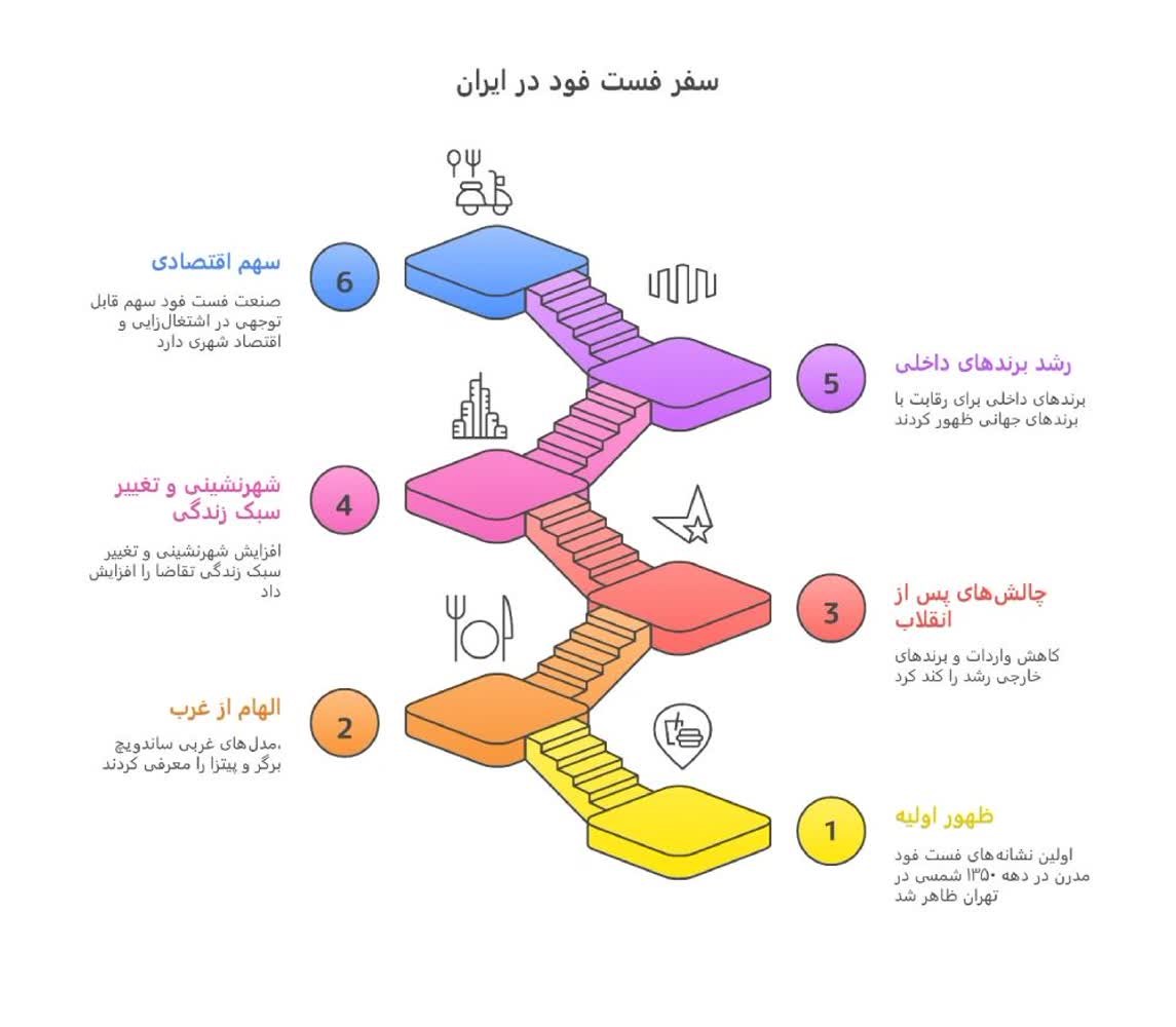 پس از انقلاب اسلامی و محدودیت‌های واردات کالا و برندهای خارجی، توسعه فست فود در ایران برای مدتی متوقف شد اما در دهه‌های اخیر به دلیل افزایش شهرنشینی و تغییر سبک زندگی مردم،  مجددا گرایش ها به سمت این وعده های غذایی رفت.